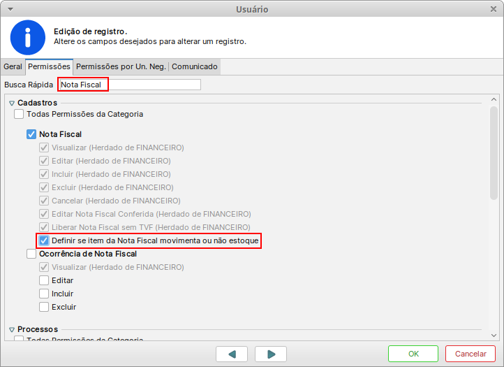 Para alteramos um produto para não realizar movimentação, devemos primeiramente liberar a Permissão de Usuário.
