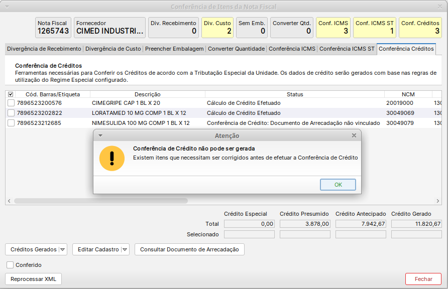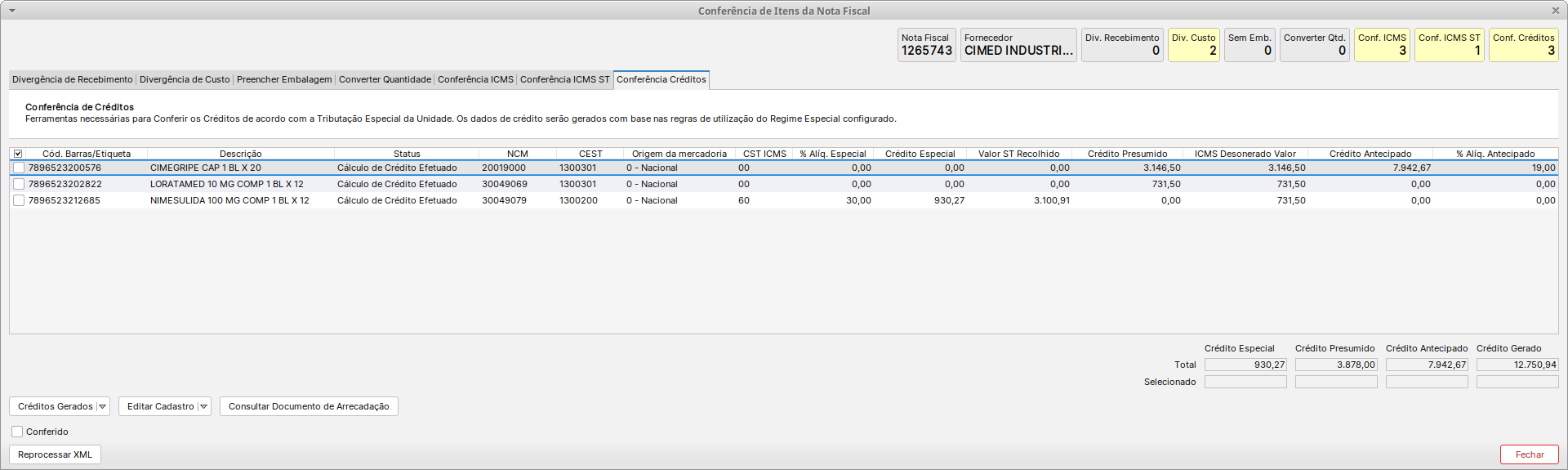 - As faixas de NCM podem ser configurados pela configuração avançada: NotaFiscal.ConferenciaCredito.NCMMedicamento.
