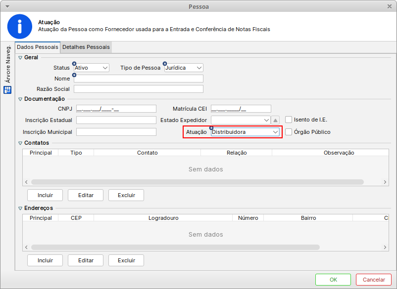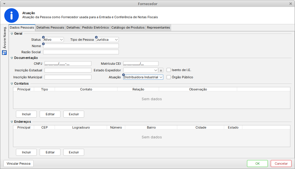 - Acessar o menu Compra → Cadastros → Fornecedor → aba Dados Pessoais: