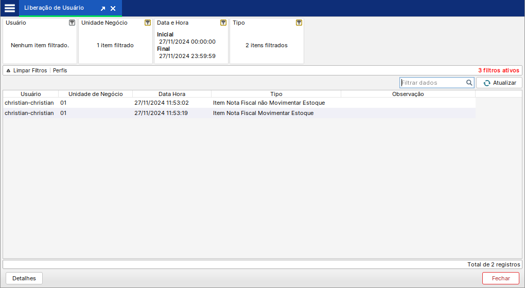 Observação: O registro só será feito, caso o colaborador necessite informar a senha de liberação. Caso o usuário já possua a permissão, não será gerado o Log.