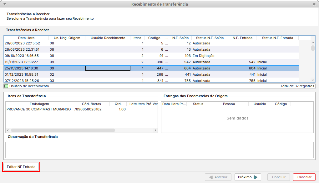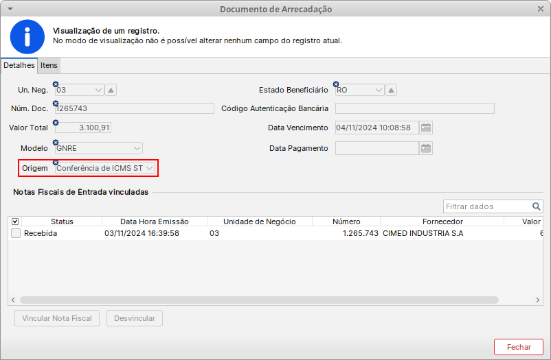 Opção Detalhes habilita a tela de Nota Fiscal de Entrada.