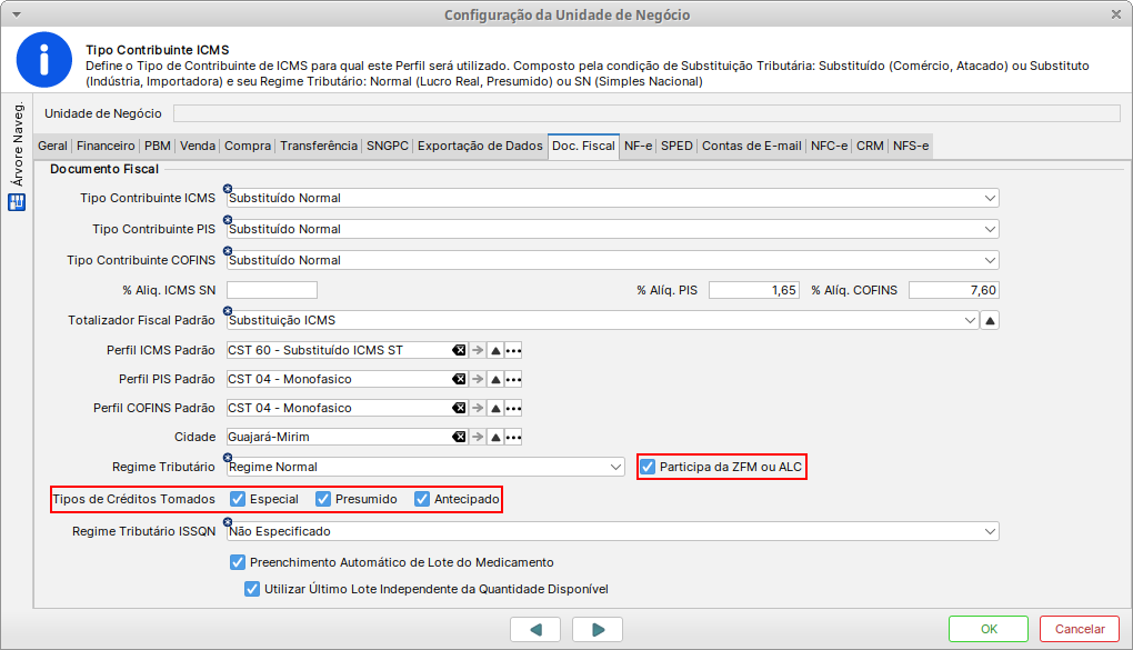 - Acessar o menu Configuração → Configurações da Unidade de Negócio → aba Doc. Fiscal: